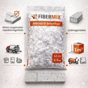 Az a szál, amiből csak “1 kg kell” fibrillált szál. Statikailag nem méretezhető, a beton megerősítésében nem játszik szerepet. Feladata a beton kötés közbeni repedéshajlandóságának csökkentése, és a kész beton tűzállóságát növeli.