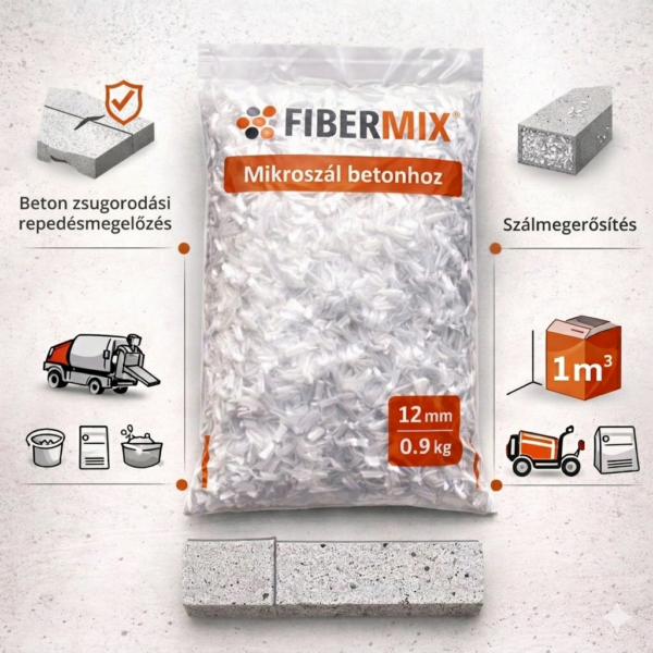 A FiberMix mikroszál, 12 mm-es nagyteljesítményű, megakadályozza a beton zsugorodása során kialakuló repedéseket.